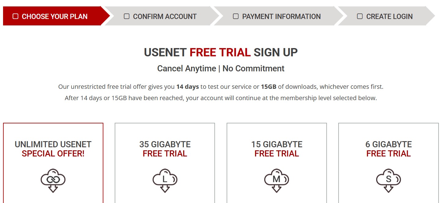 Fast Usenet offers a 14-day free trial (up to 15 GB of downloads) for new users, which is great for test-driving the service. The trial is unrestricted – you get full speed, 50 connections, and access to everything (same as a paid account) during that period, with the only limit being 15 GB of usage or 14 days. If you hit 15 GB before 14 days, the trial ends at that point; otherwise you have the full two weeks. This trial is “cancel anytime, no commitment,” meaning if you cancel before it’s over, you won’t be billed. It effectively replaces a money-back guarantee since you can try before paying.