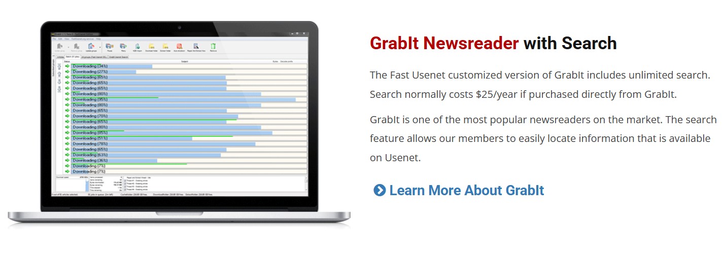 Fast Usenet includes a free, customized version of the GrabIt newsreader with every account. This “Fast Usenet Edition” of GrabIt is pre-configured for their service, making it very easy for newcomers to get started. You download the client from their site, log in with the credentials you made during sign-up, and you’re basically ready to browse and download from newsgroups. The special sauce here is that it also comes with unlimited Usenet search built-in. Normally, GrabIt’s search feature (which queries an index of Usenet content) costs around $30/year as a subscription – but Fast Usenet provides it to their members for free. This is a nice perk because it means you can search for binaries or posts across all groups without needing a separate indexing site or Usenet search engine. It won’t replace a full NZB indexer for hardcore users, but for casual searching it works well and is integrated right into the client.