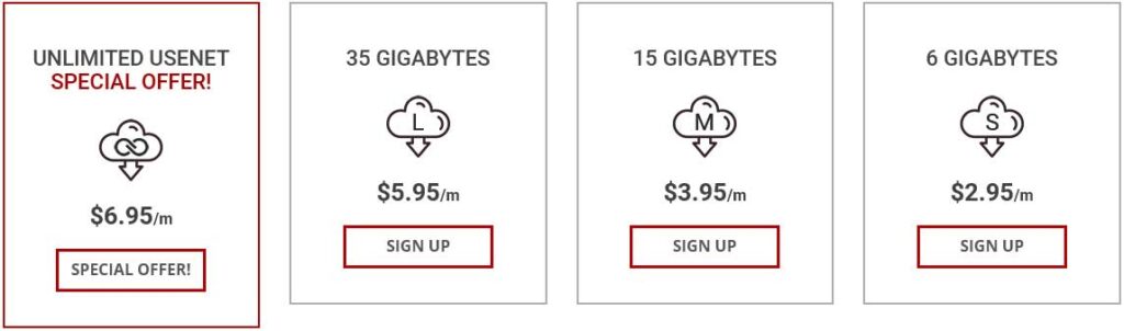 Fast Usenet’s pricing is one of its strongest selling points. They offer several monthly plans with different caps to suit various users, all of which include the same features (SSL, 50 connections, newsreader, etc.):