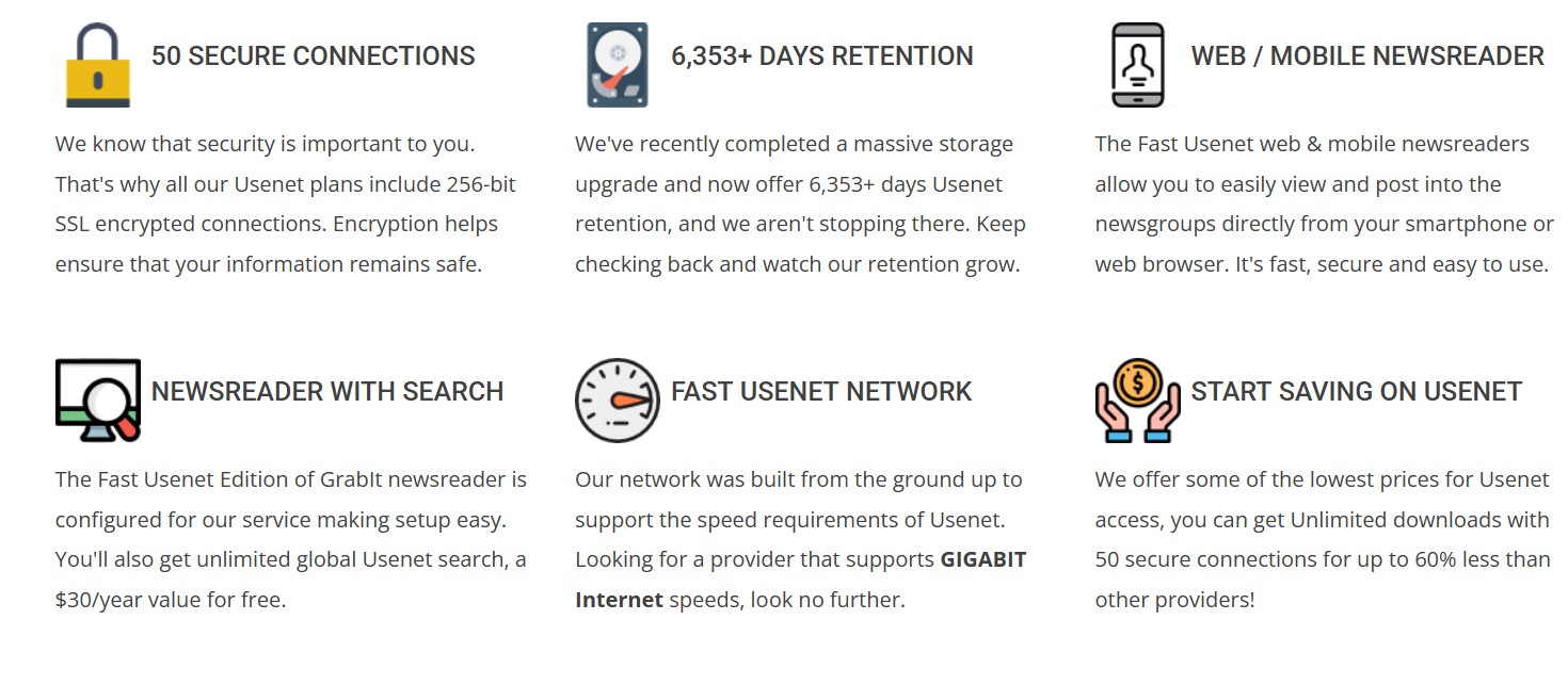 Fast Usenet is a budget-friendly Usenet provider that has been around for over a decade, offering a full set of features at a lower price point. It provides access to 120,000+ newsgroups with very high retention (over 6,396+ days and counting ) and supports up to 50 simultaneous connections with 256-bit SSL encryption on all plans. All accounts include the custom Fast Usenet Edition of the GrabIt newsreader (with integrated search) as well as web and mobile Usenet access. The service’s pitch is essentially “all the Usenet basics (and then some) for up to 60% less cost than big-name competitors.” In this review, I’ll share an experienced perspective on where Fast Usenet delivers and where it falls short, including direct comparisons to a leading provider like UsenetServer.