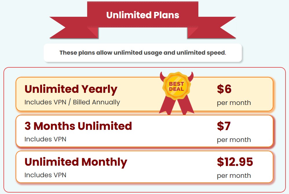 - Unlimited Monthly: $12.95 per month (billed monthly). This is a true unlimited plan with no download caps, includes the free VPN service.