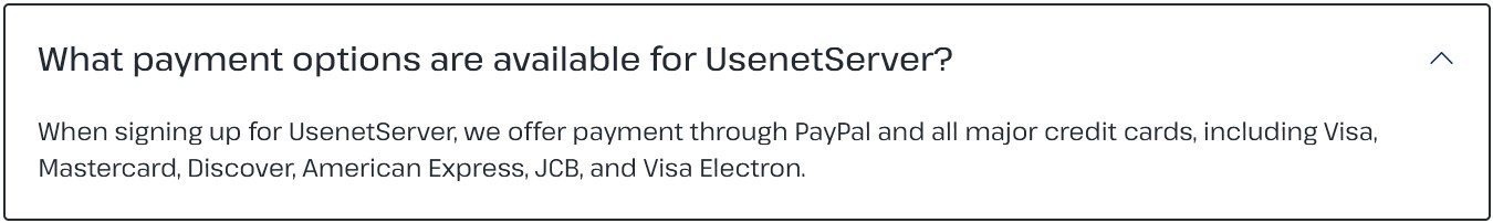 Signing up for UsenetServer, you can pay with all major standard methods. They accept all major credit cards (Visa, MasterCard, Discover, American Express, JCB, etc.) as well as PayPal for those who prefer using a PayPal balance or linking to a bank account. This covers the majority of users, but notably, UsenetServer does not list any cryptocurrency or anonymous payment options. So if you were hoping to pay with Bitcoin or other crypto for privacy, that’s not currently supported – your best bet in that case would be to use an intermediary (like a prepaid card or Privacy.com virtual card via PayPal) or consider a provider that explicitly takes crypto. Neither Easynews nor Newshosting is particularly ahead in this regard; Newshosting also sticks to card/PayPal and has no crypto payments. A few European providers (e.g., Eweka or some resellers) do accept crypto or bank transfers, but with UsenetServer being a US-based service, the payment methods are what you’d expect for an online subscription.