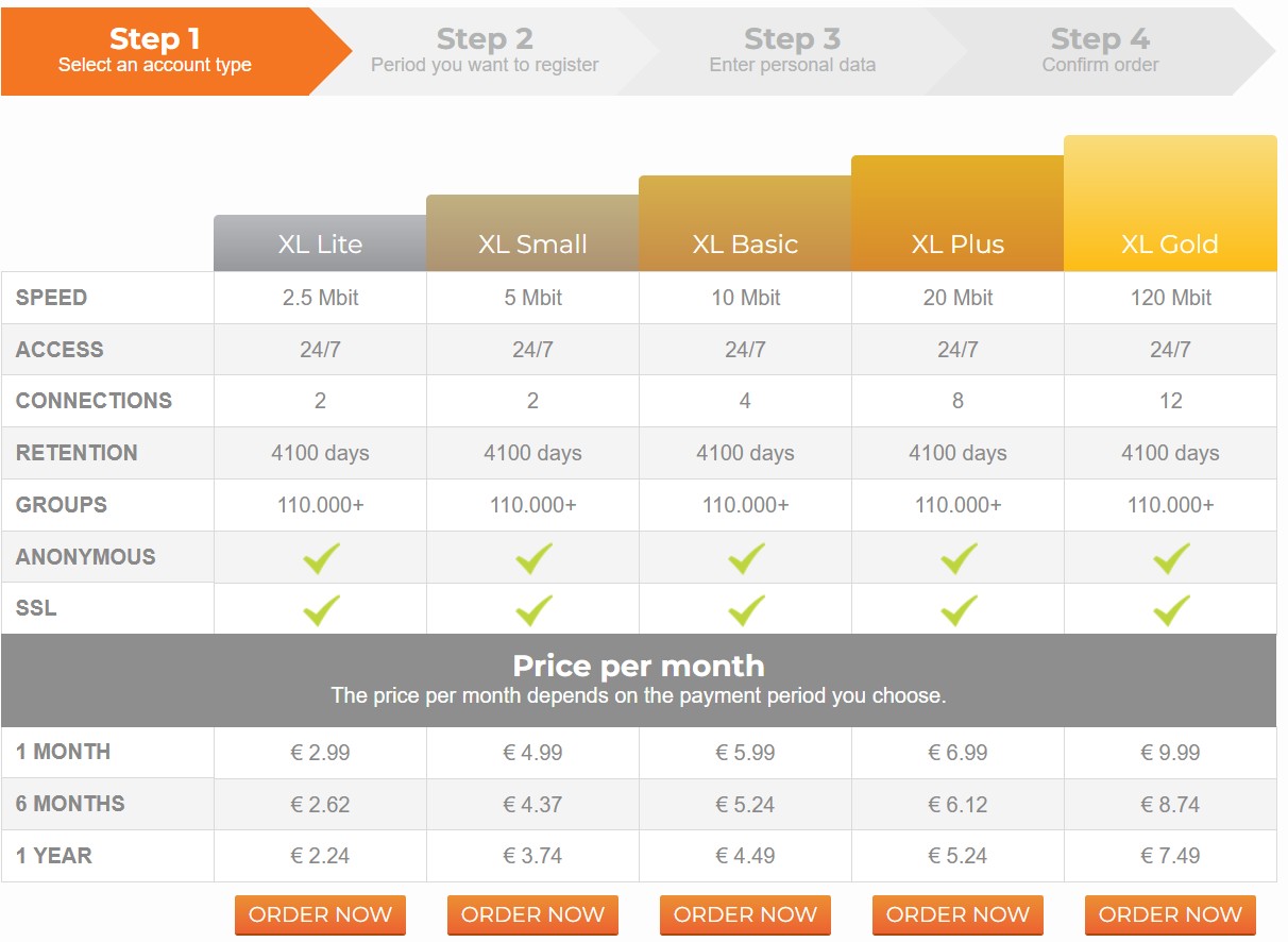 XLNed offers five subscription plans, which mainly differ in their speed caps and allowed connections (all other features – retention, newsgroup access, posting, SSL, etc. – are the same across plans). The longer the subscription term you choose, the lower the effective monthly cost becomes. Below are the current plans and their key differences: